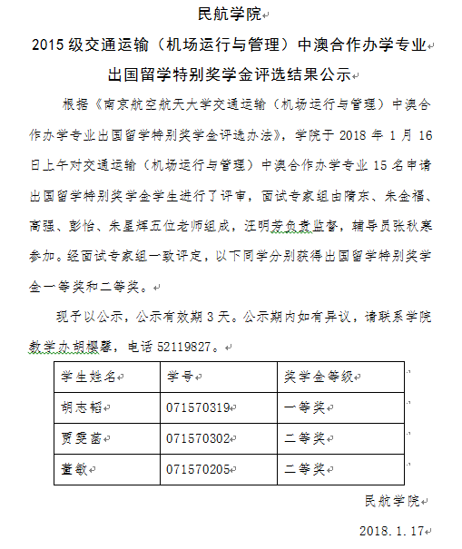 二次元 2015级交通运输(机场运行与管理)中澳合作办学专业 出国留学特别奖学金评选结果公示