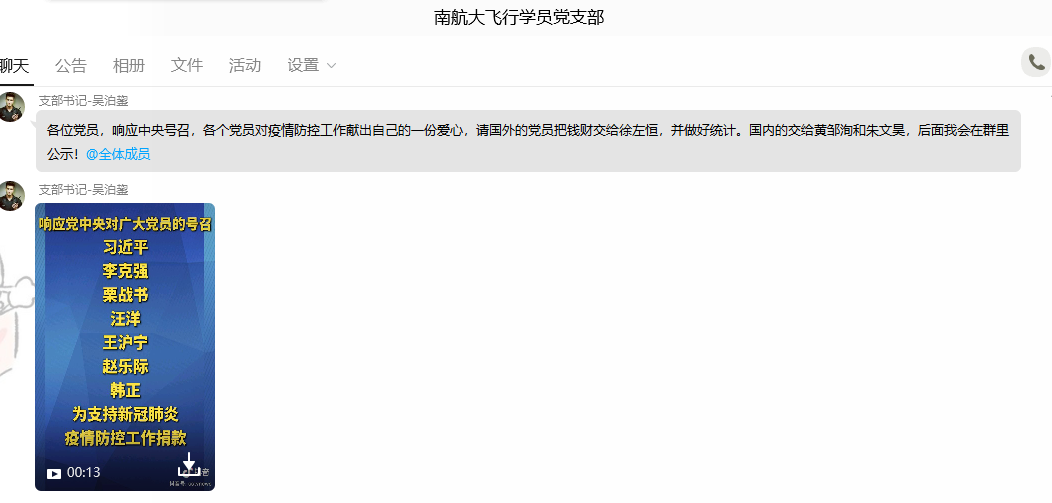 在全国人民进行共同战“疫”之时,习近平总书记指出要紧紧依靠人民群众坚决打赢疫情防控阻击战,同时强调党员群体要带头冲在前面。我院飞行学生党支部积极响应国家、校党委和学院党委号召,国内外的支部成员戮力同心,共克时艰。