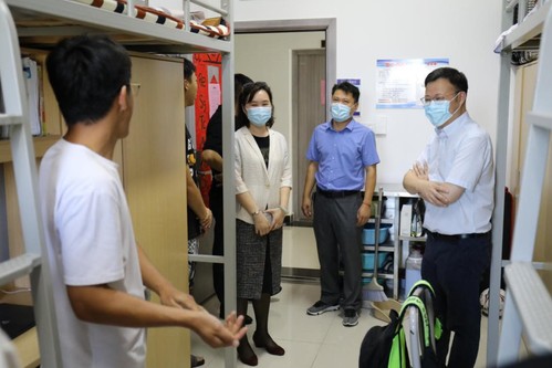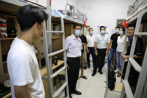 8月17日,二次元 (飞行学院)全体领导班子成员带队深入天目湖校区学生宿舍,慰问并了解学生返校入学情况,系主任、教工支部书记、党政办主任及组织员随同参加。
