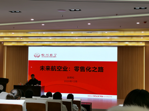 赵晓松副总经理分析了对航空产业具有较高水平影响力和不确定性的主要因素,并通过新冠疫情实例对全球航空业的影响,从实际运行的角度提出了对于行业未来三十年的发展展望。除此之外,赵晓松副总经理还针对当前阶段航空业数字化零售转型这一趋势,介绍了“新分销能力(NewDistributionCapacity,NDC)”、“动态订单(DynamicOffer)”、“单一订单(OneOrder)”对航空公司收益管理和业务运营的发展影响,根据自身的从业经验总结了零售化转型在民航运输业的应用和对未来发展提出愿景。历时两个小时的报告内容丰富,干货满满,对于我院师生拓宽研究视野,把握最新行业发展方向具有重要意义。