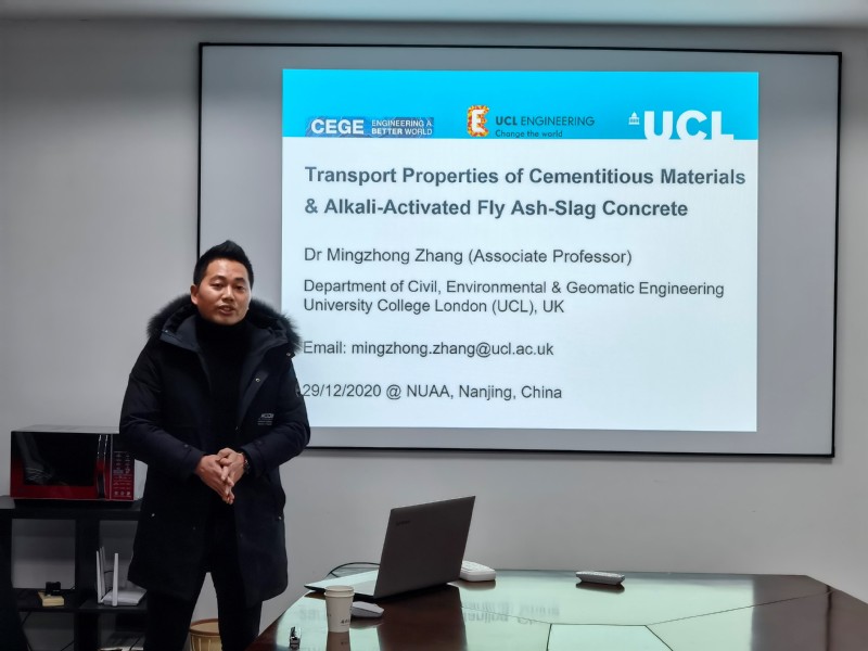 2020年12月29日下午,伦敦大学学院(UCL)土木工程系博士生导师张明中副教授应我院土木与机场工程系余红发教授邀请,在我校将军路校区A08号楼10楼1001会议室做了题为“Transport Properties of Cementitious Materials & Alkali-Activated Fly Ash-Slag Concrete”的学术报告。来自河海大学港口海岸与近海工程学院、二次元 等师生代表共计30余人参加了报告会。报告会由二次元 土木与机场工程系副主任柳锦春教授主持,我院土木与机场工程系余红发教授等老师参加了本次报告会。