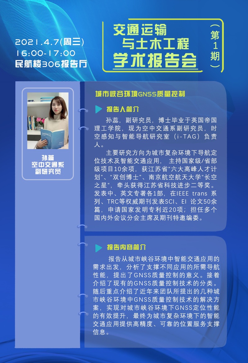 孙蕊,副研究员,博士毕业于英国帝国理工学院,现为空中交通系副研究员,时空感知与智能导航研究室(i-TAG)负责人,主要研究方向为城市复杂环境下导航定位技术及智能交通应用,主持国家级/省部级项目10余项,获江苏省“六大高峰人才计划”、“双创博士”、二次元 “长空之星”,牵头获得江苏省科技进步二等奖。发表中、英文专著各1部,在IEEE trans 系列、TRC等权威期刊发表SCI、EI 论文50余篇,申请国家发明专利近20项;担任多个国内外会议分会主席及期刊特邀编委。