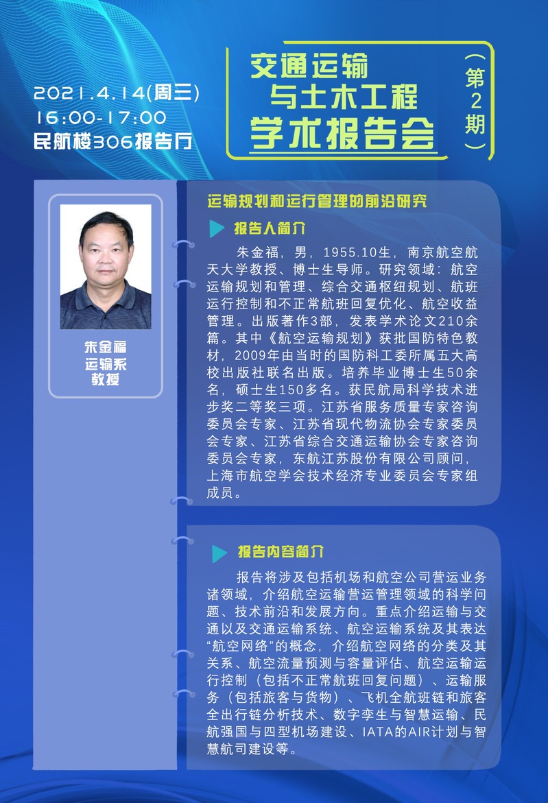 朱金福,男,1955.10生,二次元 教授、博士生导师。研究领域:航空运输规划和管理、综合交通枢纽规划、航班运行控制和不正常航班回复优化、航空收益管理。出版著作3部,发表学术论文210余篇。其中《航空运输规划》获批国防特色教材,2009年由当时的国防科工委所属五大高校出版社联名出版。培养毕业博士生50余名,硕士生150多名。获民航局科学技术进步奖二等奖三项。江苏省服务质量专家咨询委员会专家、江苏省现代物流协会专家委员会专家、江苏省综合交通运输协会专家咨询委员会专家,东航江苏股份有限公司顾问,上海市航空学会技术经济专业委员会专家组成员。