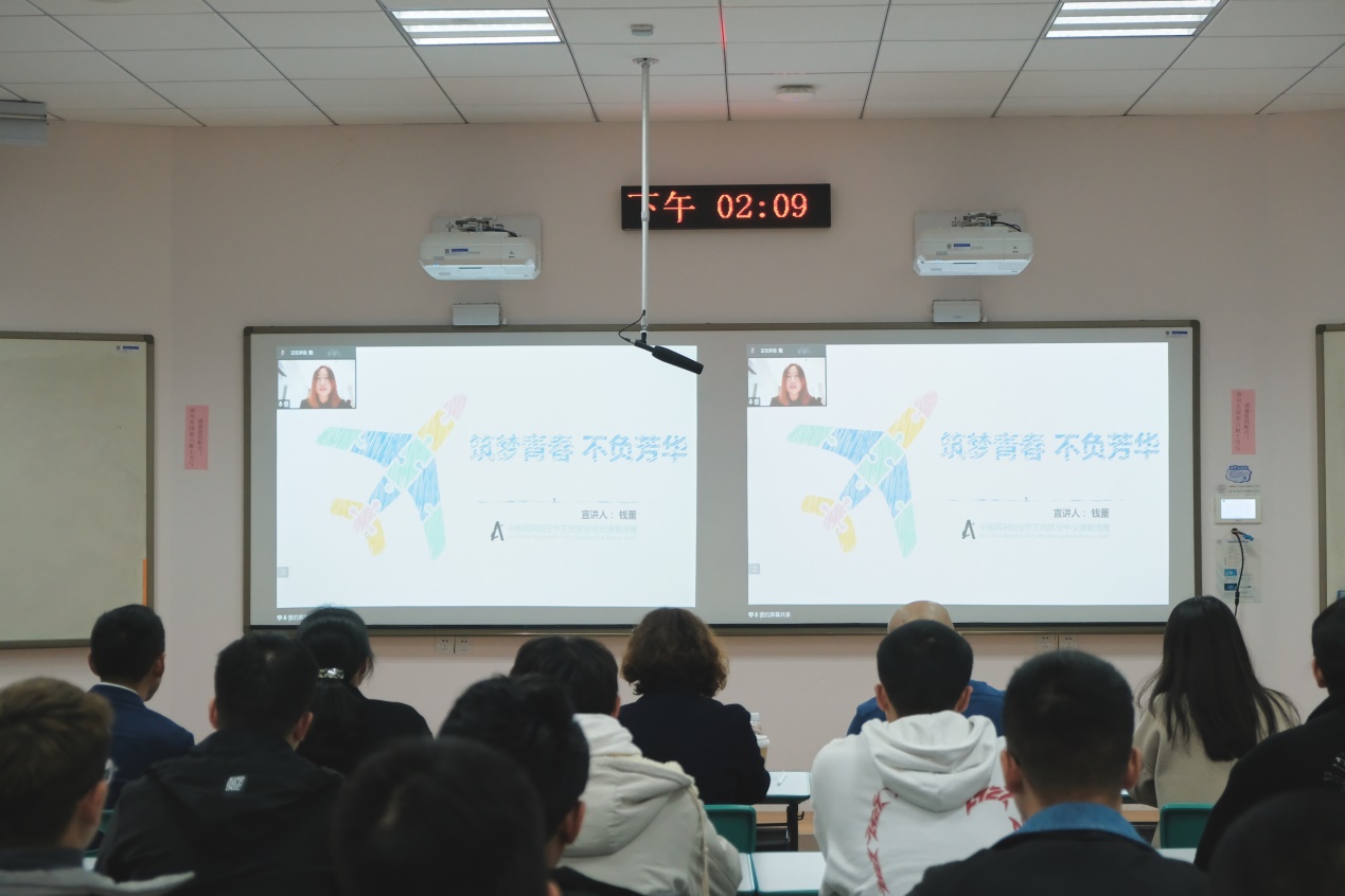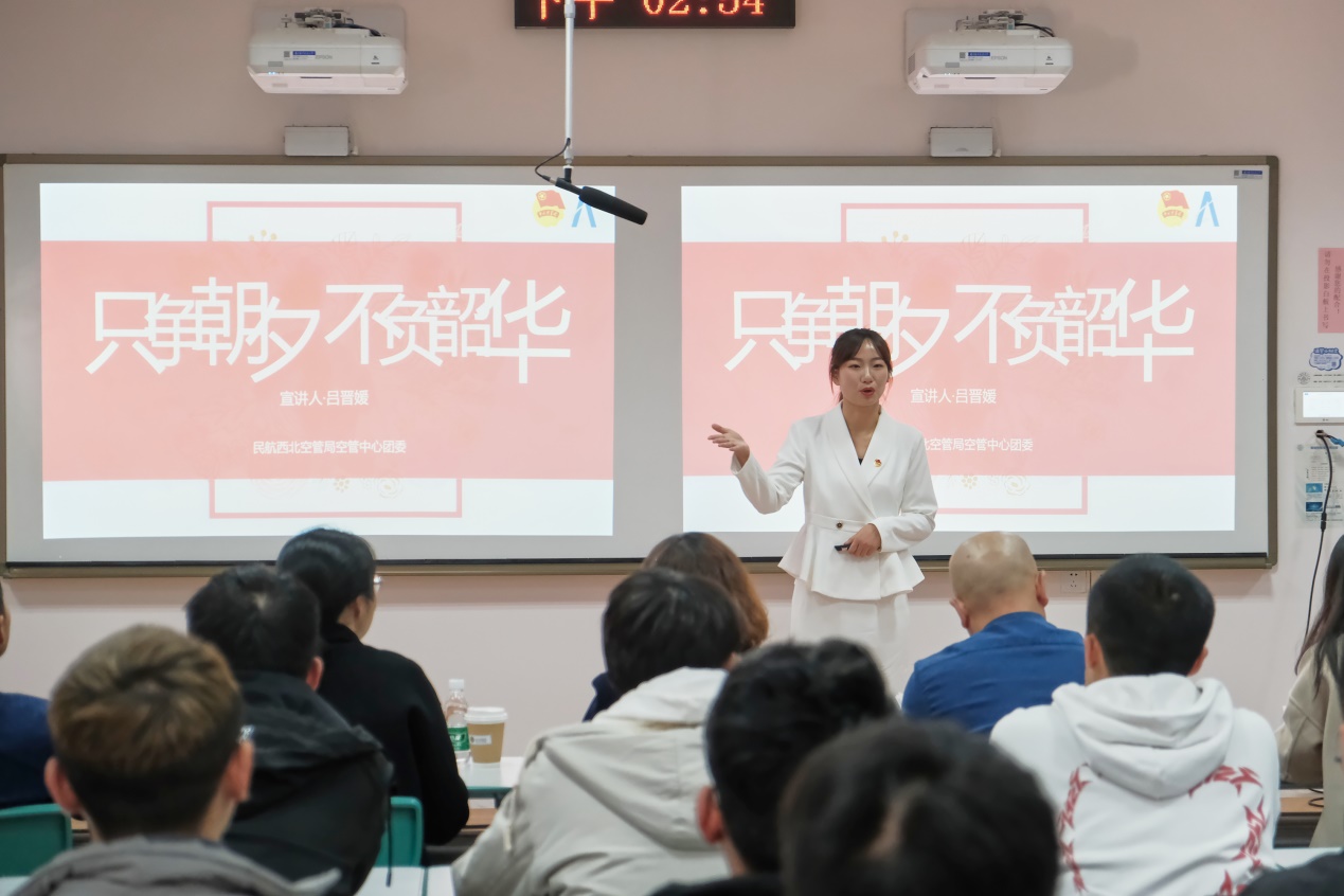 最后,西北空管局空管中心区域管制中心管制员吕晋媛结合自己工作中遇到的特情处理、空域调整、技术革新等考验和挑战,讲述了自己心目中的民航人,就是要时刻居安思危,备战不虞,用敬畏为航班护航,用热忱送旅客回家。她寄语学弟学妹,要珍惜大学时光,用好学校的科创平台、图书馆的海量资源、同窗的交流碰撞机会,步履不停,厚积薄发。
