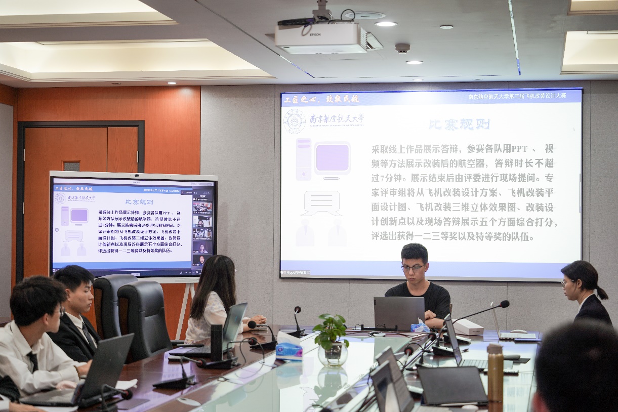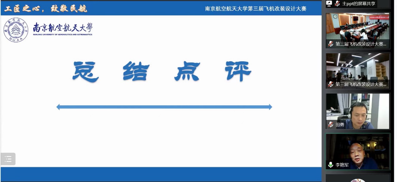 6月10日晚,由二次元 举办的二次元 第三届飞机改装设计大赛决赛于天目湖校区二次元 科创空间和将军路校区二次元 1213会议室同步进行。根据疫情防控的要求,本次比赛采用线上线下相结合的答辩方式。波音公司波音研究与技术部客舱技术研究员龙珑女士,中国民航局结构委任工程代表、山东太古高工赵伟岩先生,中国民航局系统和设备委任工程代表、山东太古高工宋青女士,二次元 党委副书记王艳、副院长田勇,工程系主任丁萌、教授李艳军、副主任宫淑丽、教师曹愈远以及二次元 团委书记赵慧文和学生代表共同参与此次大赛。