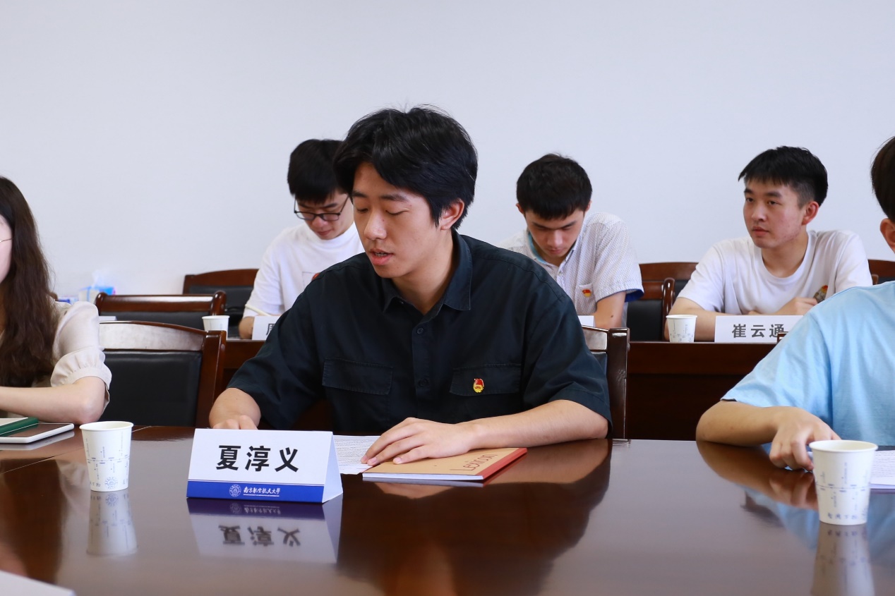 党员代表吴天禹以“依托党支部帮扶同学,发扬党员先锋模范作用”为主题进行交流,重点对学生党员在学院和年级指导下依托党支部开展学业帮扶、发挥学生党员先进性作了经验交流和感悟分享。团员代表徐腾在交流学习心得时指出,要牢记总书记的嘱托,以追求进步作为青年最宝贵的特质,不负党和人民最殷切的希望。严于律己,做好本职工作,发挥模范作用,是他作为寝室长和共青团员义不容辞的责任。在“学生代表说专业”环节,赵煜新结合习近平总书记重要讲话精神讲述专业特色,提出机务专业学生应着眼于民航飞行器健康管理和持续适航保障,应把安全意识和可持续发展理念时刻牢记心中。