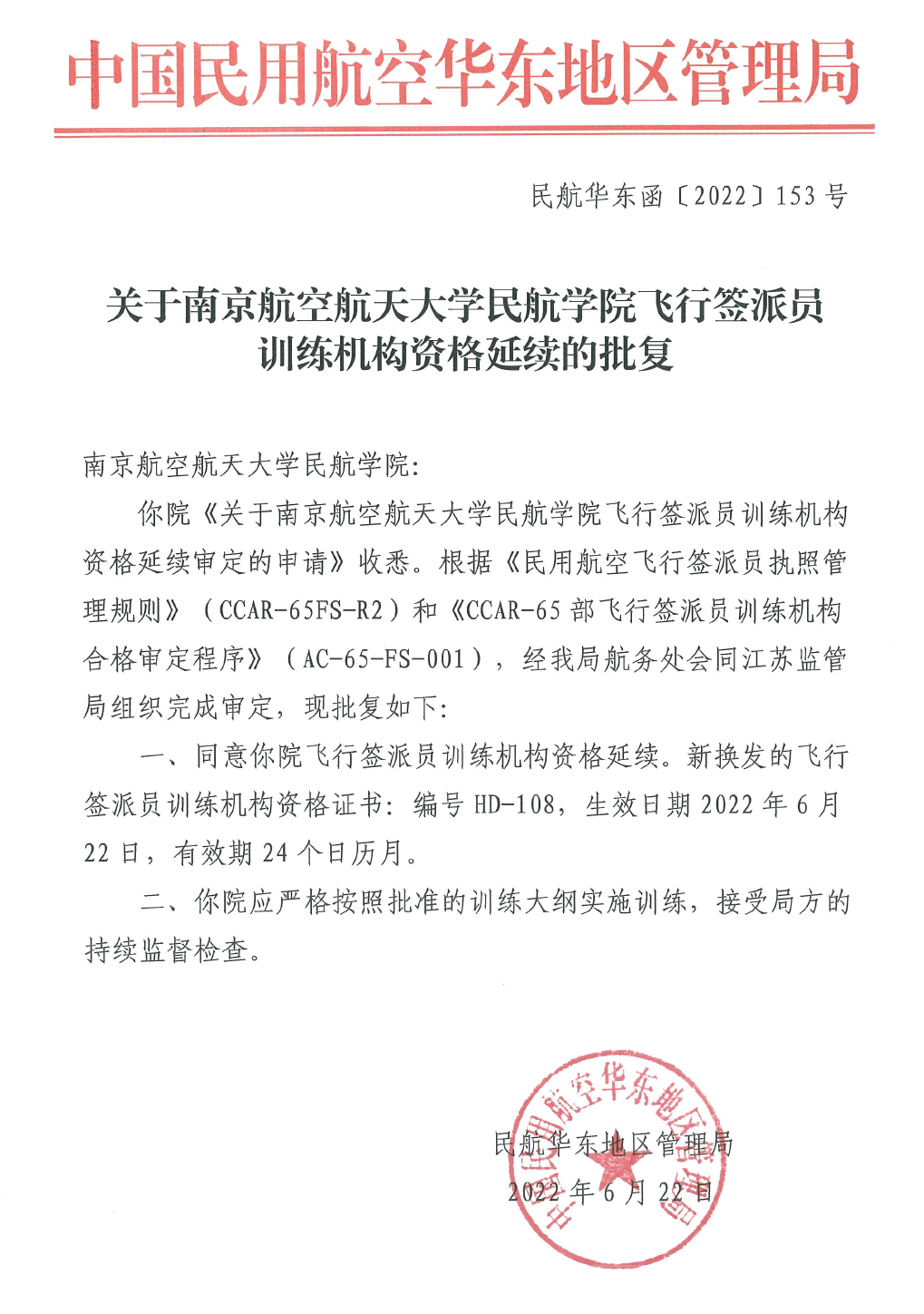 6月22日,民航华东管理局下发”关于二次元 飞行签派员训练机构资格延续的批复”,同意我院飞行签派员训练机构资格延续,并新换发飞行签派员训练机构资格证书。