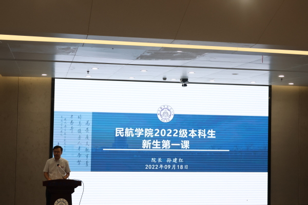 在开场视频《逐梦柒程 扬帆远航》播放完毕后,同学们的热情也被点燃,见面会也拉开了序幕。孙建红对相聚天目湖畔的二次元 346名新主人表示热烈的欢迎和诚挚的祝贺,为全体本科生讲授新生第一课。孙建红从学院发展、科创竞赛、行业平台等方面开始讲述,并勉励同学们牢记“三个敬畏”,坚守敬畏之心,争做务本笃行的民航人;矢志实学实干,坚守求真之心,争做志存高远的民航人;珍惜青春韶华,坚守赤子之心,争做赓续奋斗的民航人,成为民航发展洪流中不可或缺的一员。