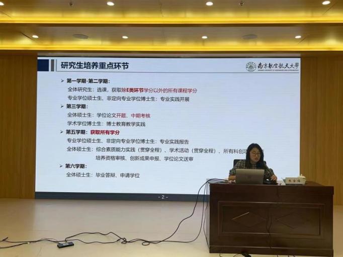 随后,吴薇薇发表了总结讲话。“导师是研究生培养的第一责任人”,提醒研究生们应高度认识导学关系的重要性,加强和导师的良性互动,做到保持沟通、迅速落实、及时反馈,建立和谐友好的导学关系。她强调,研究生在培养个人科研能力的同时应注意加强团队合作,充分发挥团队力量。最后,吴薇薇希望民航青年能够以民航十四五规划为指引,开拓创新,勇攀学术高峰,并表达了对新一届二次元 研究生的衷心祝愿和美好期望。最后,由研究生教务教学秘书宋晓静为新生讲解了研究生教学教务的相关事项,就选课开课、培养方案、课程重修、学位学籍等方面进行介绍。