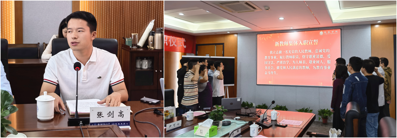 随后,运输系张剑高老师作为新教师代表发言,张老师首先表达了对朱老师的敬仰和感谢,然后对自身未来的教学工作做出承诺,并希望在之后的教育教学工作中尽献一份自身的能力。并由黄天翔老师带领新教师进行集体入职宣誓,为各自的教师身份发表宣告和誓言。