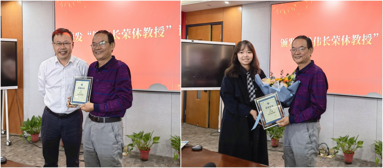 座谈会后,孙建红代表全体师生给朱老师颁发学院“钱伟长荣休教授”证书,学生代表献花。