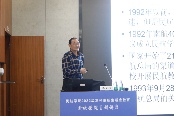 朱金福如数家珍讲述学院和民航业的发展史和大事件。改革开放以后民航业飞速发展,在国家部委、学校和校友们的鼎力支持下,二次元 于1993年正式成立并一步步发展壮大,离不开一代代民航人的不懈努力和接力奋斗。随后,朱金福从行业角度,用客观数据向同学们普及了民航及其发展前景,呼吁同学们开阔国际视野、树立创新意识、保持优秀品格、锻炼专业思维,为今后在民航发展前沿的奋斗路奠定基础,将实现民航强国理想成为矢志不渝的精神追求和终生事业。面对学习困难,他比喻道:“困难就像山,逃避积攒,山峰便会高耸入云;逐一击破,便会坦坦荡荡一马平川。”最后,朱金福向同学们提出殷切期盼,他希望同学们秉持“团结、俭朴、唯实、创新”的八字校风,让“爱校”成为大家的行动自觉、让“荣院”成为共同的使命担当,加倍努力、奋勇争先,相信自己、相信专业、相信学校,珍惜时间、把握当先、逐梦前行,以奋发向上的姿态和孜孜不倦的精神,成为更加优秀的民航人!