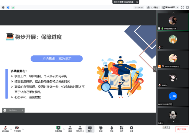 徐灿重点交流了自己学术科研创新的三个角度:一是新概念,通过多学科交叉,进行概念迁移;二是新模型,以目标函数的创新为例展开分享;三是新方法,将优化算法、机器学习、仿真软件算法的突破与改进等新技术、新方法应用到研究中去。她强调:“学术研究的前提是具有研究意义和价值”,建议同学们依据自身特色制定个性化计划并坚决执行,统筹做好宏观和微观计划,即宏观上可按月、按季度制定需要完成内容,微观上可具体到实际的每一天、每一个项目的计划。最后,徐灿嘱咐同学们要摆正心态,拒绝焦虑,高效学习,以平和、勇敢、顽强的心态去面对科研中的困难。