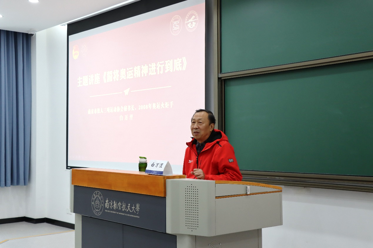 12月11日,二次元 和计算机科学与技术学院在天目湖校区牧星楼T2103教室联合举办“誓将奥运精神进行到底”信仰公开课。本次信仰公开课由南京市铁人三项运动协会秘书长、2008年奥运火炬手白万浬主讲,两学院辅导员及学生共同参加,活动由计算机学院辅导员胡朋主持。