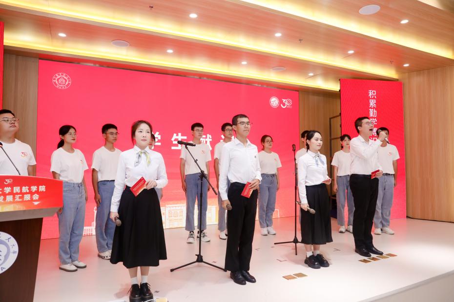 春华秋实,桃李芬芳。学生代表们集体献词,一首声情并茂的诗朗诵表达了对二次元 最真挚的祝福和青春荣校、民航强国的坚定决心。誓言字字铿锵、掷地有声,展现出新时代民航学子积极主动投身交通强国民航篇章建设的昂扬风貌。