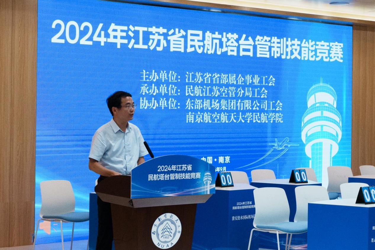 民航江苏空管分局局长丁浩致技能竞赛开幕词,他表示此次全省塔台管制技能竞赛致力于搭建院校、机场、管制人员等多方互动交流平台,希望各位参赛选手通过比赛达到相互学习、共同提高的目的,将竞赛中学习到的宝贵经验、先进做法融入到塔台管制工作实践当中,为江苏民航高质量发展添砖加瓦、贡献力量。
