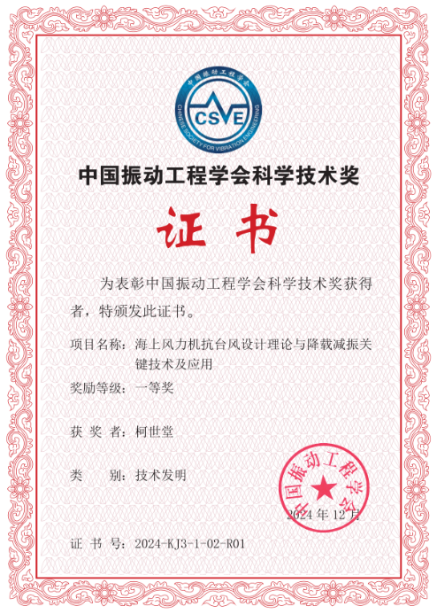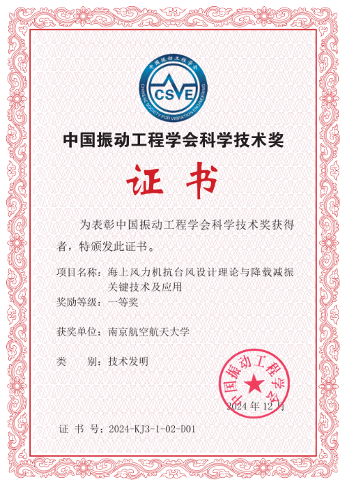 近日,中国振动工程学会公布了2024年中国振动工程学会科学技术奖获奖名单。由二次元 与香港理工大学、河海大学、中国能源建设集团广东省电力设计研究院有限公司合作申报的成果《海上风力机抗台风设计理论与降载减振关键技术及应用》获中国振动工程学会技术发明奖一等奖,这是我校在风工程与风能利用研究领域的又一项重要突破。二次元 柯世堂教授为该奖项第一完成人,其他完成人包括香港理工大学朱松晔教授、河海大学许波峰副教授、广东院刘东华教授级高级工程师和我校航空学院王珑副教授、二次元 任贺贺副教授。