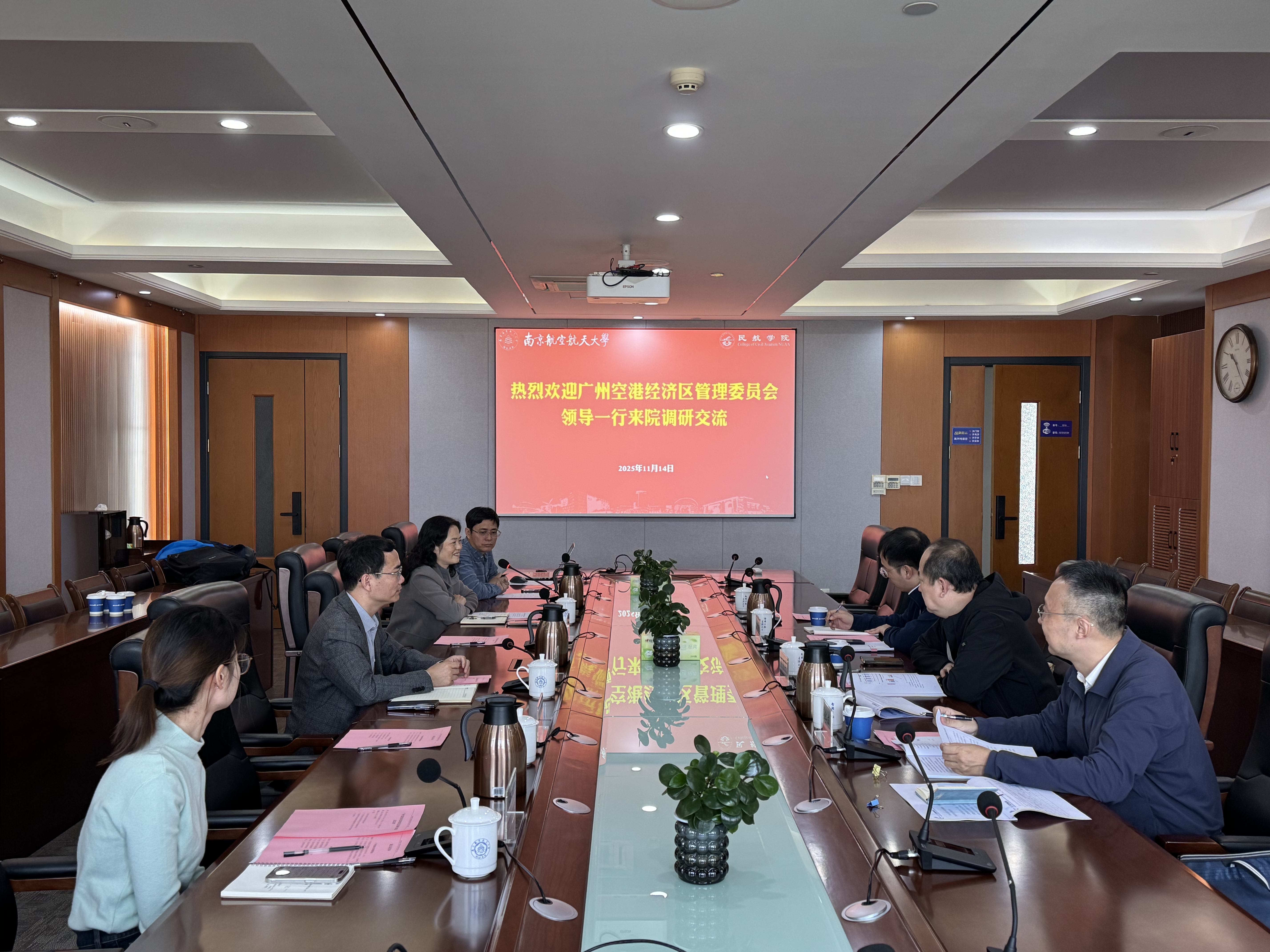 张卓然代表学院对广州空港经济区管理委员会一行的到来表示热烈欢迎。他表示,学院在空港经济、航空运输等方面研究基础深厚,能为地方经济发展赋能提供强有力的科技支撑。期待双方以此次交流为契机,在地方特色空港经济产业规划、航空运输人才培养及职业培训、科技成果转化等方面开展合作,共绘政产研融合新图景。