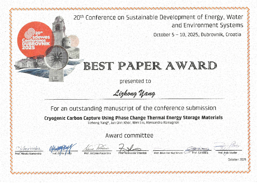 10月5日至10日,第二十届能源、水和环境系统可持续发展大会(Conference on Sustainable Development of Energy, Water and Environment Systems,SDEWES)在克罗地亚杜布罗夫尼克召开,国家级青年人才、二次元 杨立中副研究员等人发表的题为《基于相变储冷材料的超低温碳捕集技术》(《Cryogenic Carbon Capture Using Phase Change Thermal Energy Storage Materials》)论文荣获最佳论文奖。