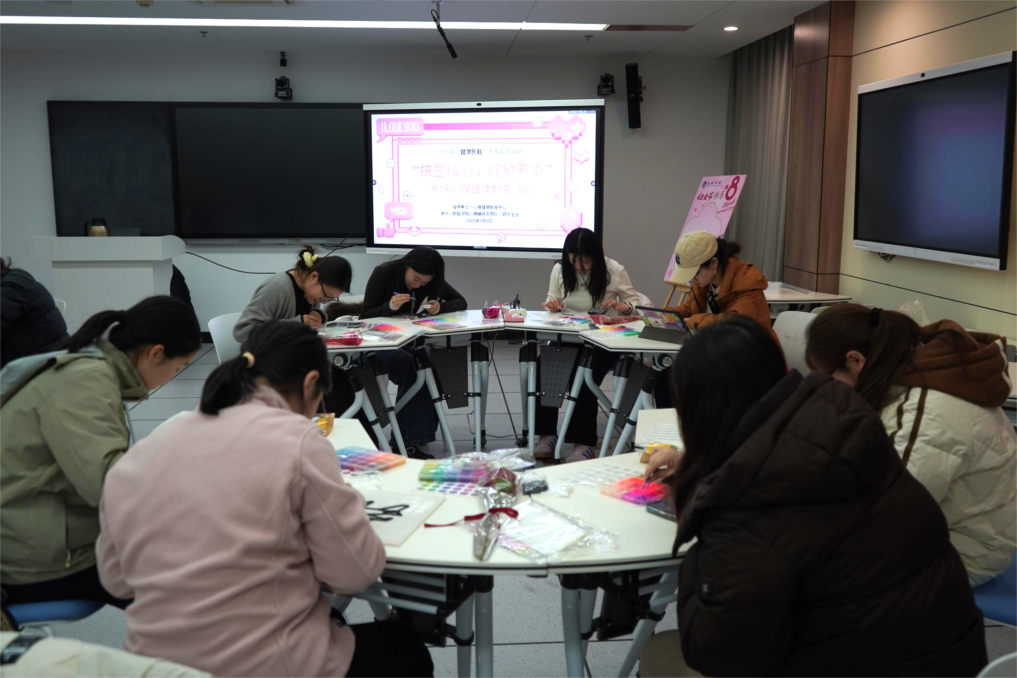 春风送暖,芳华有期。为帮助同学们丰盈精神世界,涵育审美素养,二次元 面向女同学,在2026年三八妇女节当日,采用当下流行的“拼豆”形式,开展了一场主题为“拼豆绘心绽放芳华”的美学浸润式心理健康教育活动。活动由校心理健康教育中心指导,二次元 主办。
