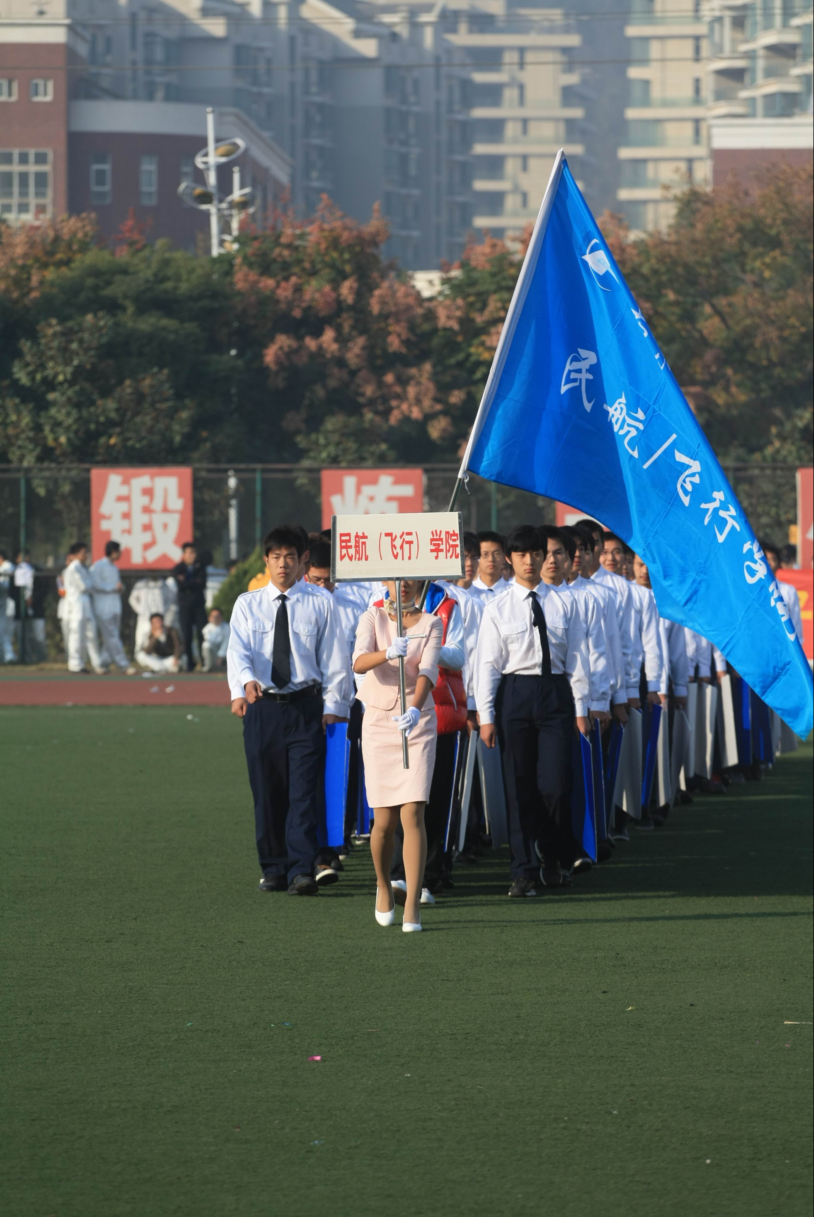 2010年11月13日上午,二次元 第四十九届校运会在将军路校区西田径场隆重开幕。在铿锵有力的入场进行曲中,我院方阵身着蓝白相称简洁清爽的服装,排列成数字“7”的队形,迈着整齐的步伐气宇宣扬地步入会场,并在经过主席台时迅速变换为“飞”字队形,彰显出民航人志在蓝天的远大理想,为运动会的开幕献上了一场视觉盛宴。