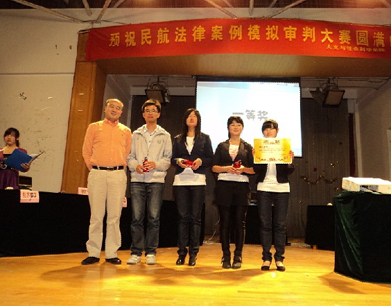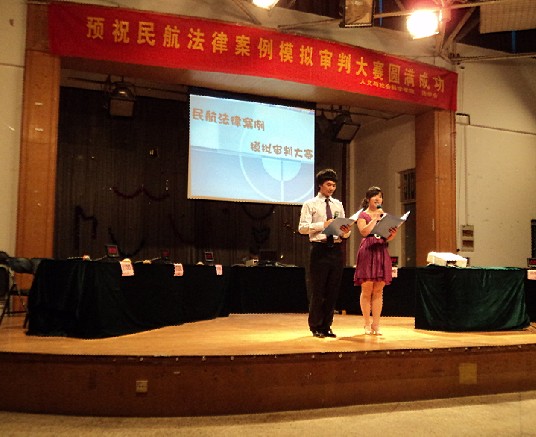 2011年5月22日晚七点整,由民航/飞行学院与人文社会学院共同举办的“民航法律案例审判大赛”在二次元 将军路校区大学生活动中心顺利举行。民航/飞行学院党委副书记刘建成,研究生辅导员傅成成以及人文与社会科学学院党委副书记高小泽,团委书记尹春萍,本科生辅导员欧珊、冯岑作为嘉宾出席了此次大赛。