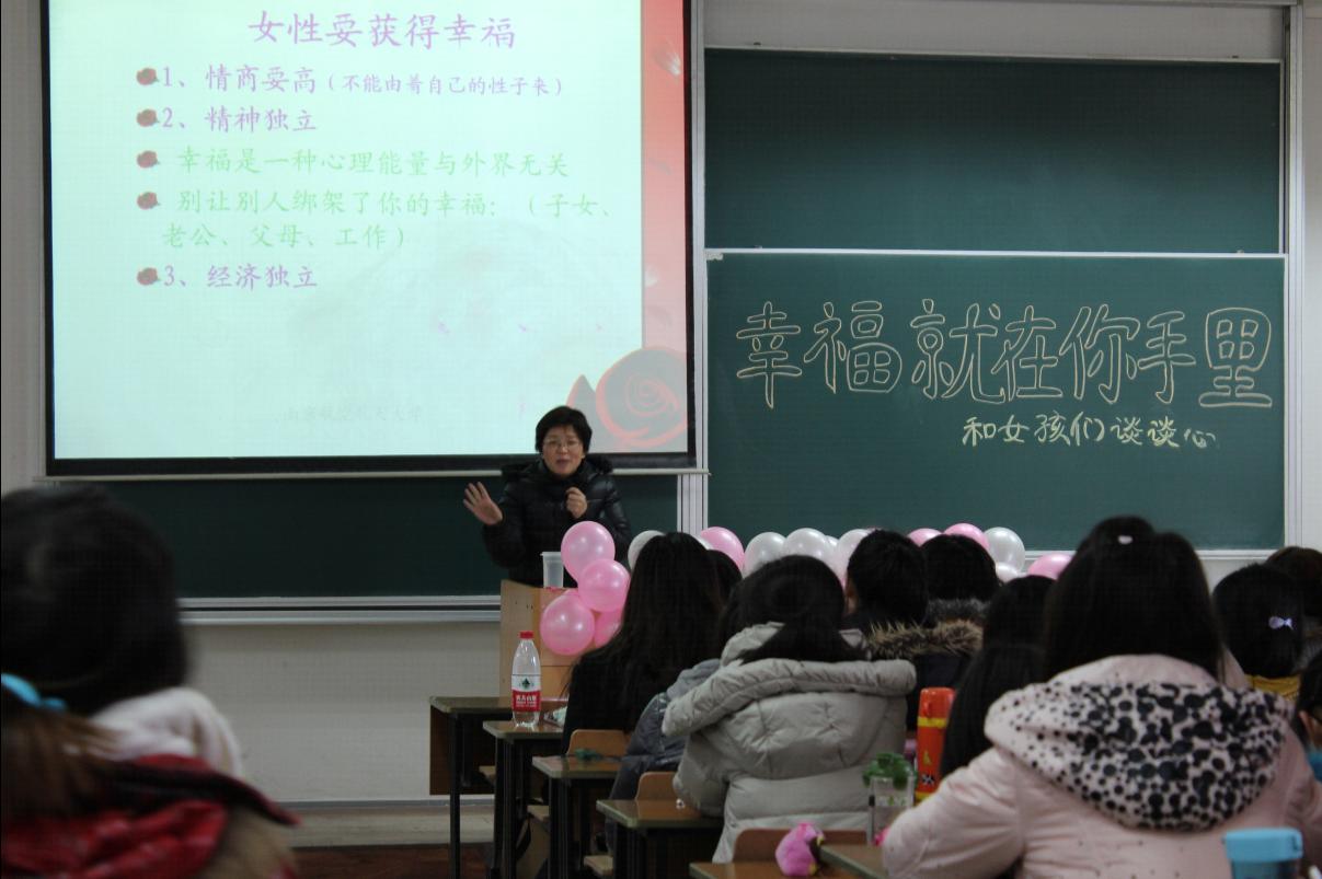 2012年3月5日下午16点在5201教室, 由民航/飞行学院主办、杨雪花老师主讲的“幸福就在你手里——和女孩儿们谈谈心”专题讲座成功举办。学院团委书记傅成成老师、部分女教工、学院全体女学生参加了本次讲座。