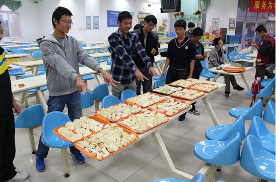 饺子来了!一盘盘热气腾腾饺子上桌,吃着自己包的饺子,同学们笑着,闹着。吃进的是饺子,咽下的是满满的幸福!饺子虽小,但承载了同学们的友谊,同学们再一次感受到集体的温馨,增强了班级的凝聚力。相信这样一个富有朝气的集体,在未来的大学生活中会越来越强,不断向前迈进!