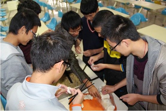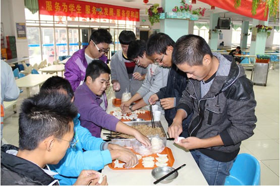 机务工程都是帅小伙,包饺子的功力丝毫不逊色于女生。左手托饺子皮,右手填馅,蘸水,封口……一板一眼,有模有样。辅导员也前来助阵,大显身手。大家兴致颇高,饺子的数量也在不断增加。不一会儿,各式各样的饺子充盈了桌子,包子形、飞碟形、菊花形……虽然饺子形状千奇百怪,但在笑声中,大家忘却了自己略显笨拙的手法,忘却了节日无法与家人团聚的失落,此时此刻,同学便是亲人,民航/飞行学院就是家!许多同学受到现场氛围的影响拿起电话,提醒父母立冬要吃饺子,告诉他们自己亲手包饺子的事,浓浓的感恩之情洋溢。