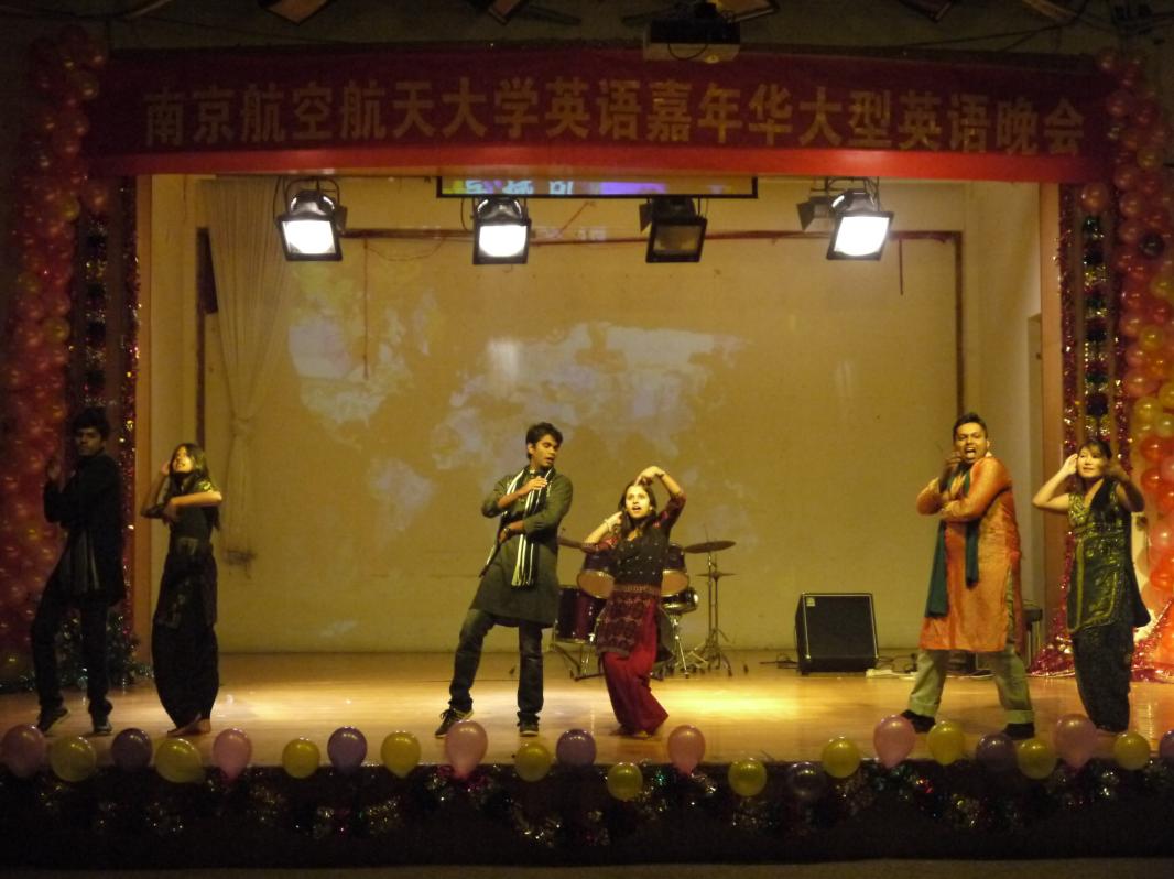 7点30分,晚会正式开始。婉转优雅的萨克斯独奏把全场观众带入晚会的氛围之中。紧接着便是来自舞协激情火辣的爵士热舞。随后的一组歌曲串烧不仅一展小飞们动听的歌喉,更是把晚会推向了第一个高潮。无论是风趣幽默的相声还是精彩绝伦的印度舞,抑或是南师大同学倾情演唱或是摇滚乐队的热血表演,无不博得阵阵观众的热烈掌声,使得整场晚会高潮迭起。为鼓励同学学习英语,英文节目也是本场晚会的亮点。南师大同学们表演的电影同期配音《魂断蓝桥》和由飞院及外院同学共同表演的英文话剧《绿野仙踪》更是让同学们眼前一亮。同学们在观看晚会的同时,也不断刷新设置在舞台旁边的“人人墙”的状态,交流着对晚会的评与看法,调侃着每个节目的特点。在晚会的游戏环节,更是邀请嘉宾老师上台和同学们一起互动。