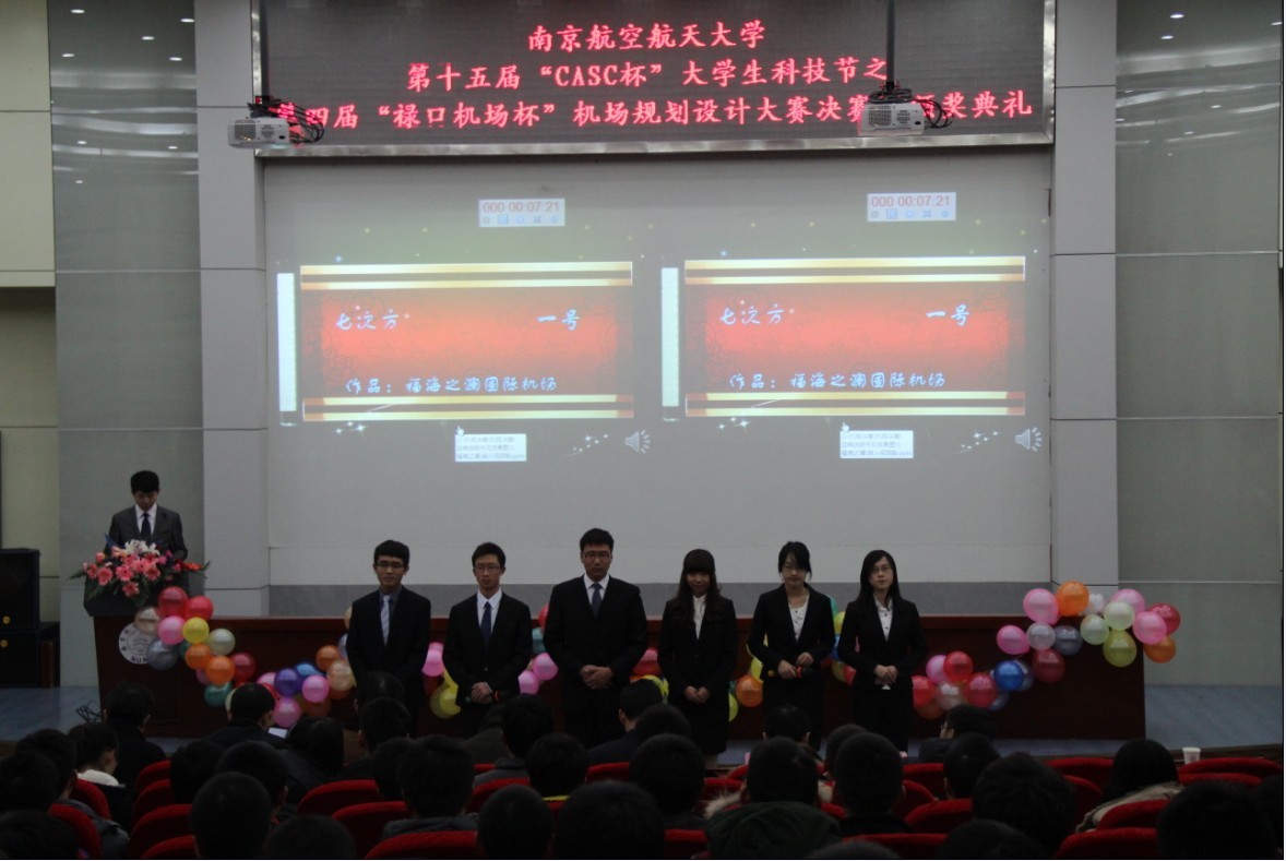 2012年12月19日,由南京禄口国际机场、校团委主办,民航/飞行学院承办的二次元 第十五届科技节之第四届“禄口机场杯”机场规划大赛决赛暨颁奖典礼在江宁校区主楼报告厅顺利举行。参加本次大赛的领导和嘉宾有南京禄口国际机场人力资源部部长王洪涛、南京禄口国际机场扩建指挥部总指挥陈邦昌、二次元 党委副书记高健老师、校团委副书记张林老师、航空宇航学院解建光教授、民航/飞行学院机场运行管理系夏洪山教授、曾小舟老师。