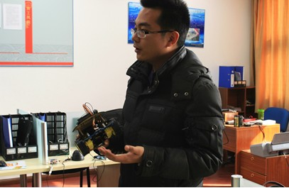 研二学生刘伟主持的项目基地。进入不大的房间,映入眼帘的是各种电器元件和开发制作工具。据刘伟介绍,他们正在研发的产品是一款智能语音遥控系统,可以实现用户通过语音对空调等家电设备进行遥控。介绍过程中,他向大家演示了该产品如何有效控制室内空调。同学们看得津津有味,兴致盎然!好奇之余,同学们还针对产品和团队管理向学长提出了自己的问题,刘伟深入浅出的回答让同学们豁然开朗。此后,走访团队还参观了学生自主创建的网络平台和校园文化产品设计室,整个行程充实而富有意义。