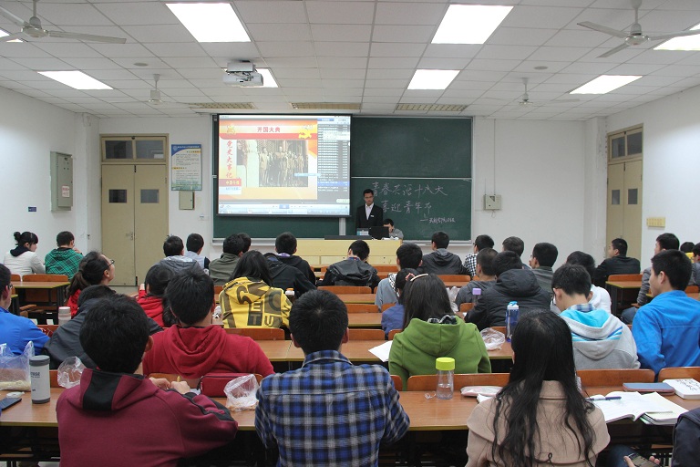 本次活动分为两个部分——“感悟分享,历练成长”与“祈福雅安,时事探讨”。在“感悟分享,历练成长”部分,首先播放了开国大典时的视频,由党员代表王永鹏同学以“看党史,党员谈改变”为主题进行了发言。接下来播放了十八大召开期间的影像画面,预备党员姜思露同学以“十八大,预备党员话感悟”为主题进行了发言,最后播放了五四青年节的相关视频,由岳振宇同学以“五四节,入党积极分子说感想”为主题进行了发言。