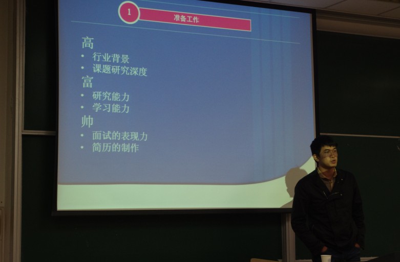活动的第二个环节是就业之星分享经验。来为大家分享经验的是已经完成签约的研三同学,他们分别是签约中航工业无线电电子研究所(615所)的赵晨阳同学,签约中船重工709研究所的陈平同学以及签约民航总局的王宏伟同学。赵晨阳结合自己的求职经历,给大家讲述提高自身素质的重要性,并给同学们提出了“高富帅”的标准。陈平通过分析影响同学们就业的客观因素,强调用知识武装自己的必要性,要求同学们根据自己的不足以及将来准备选择就业的方向提早做出改变,以使自己能够在就业时从容应对。王宏伟则针对空管局独特的面试和笔试方式,给同学们提供了非常有价值的参考意见,让想要进入空管局的同学们对学习方向有了一个很好的把握。