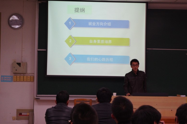 在活动的第一个环节,院研究生会的杨翼给同学们介绍了二次元 的基本就业情况。他首先以“我们能去哪儿?”的问题引出了与二次元 相关的一些单位,然后给大家细致讲解每一个单位的要求以及面向的专业。随后,他通过图表分析,给同学们介绍了二次元 毕业生的基本去向,让同学们对于就业有了一个直观的认识。