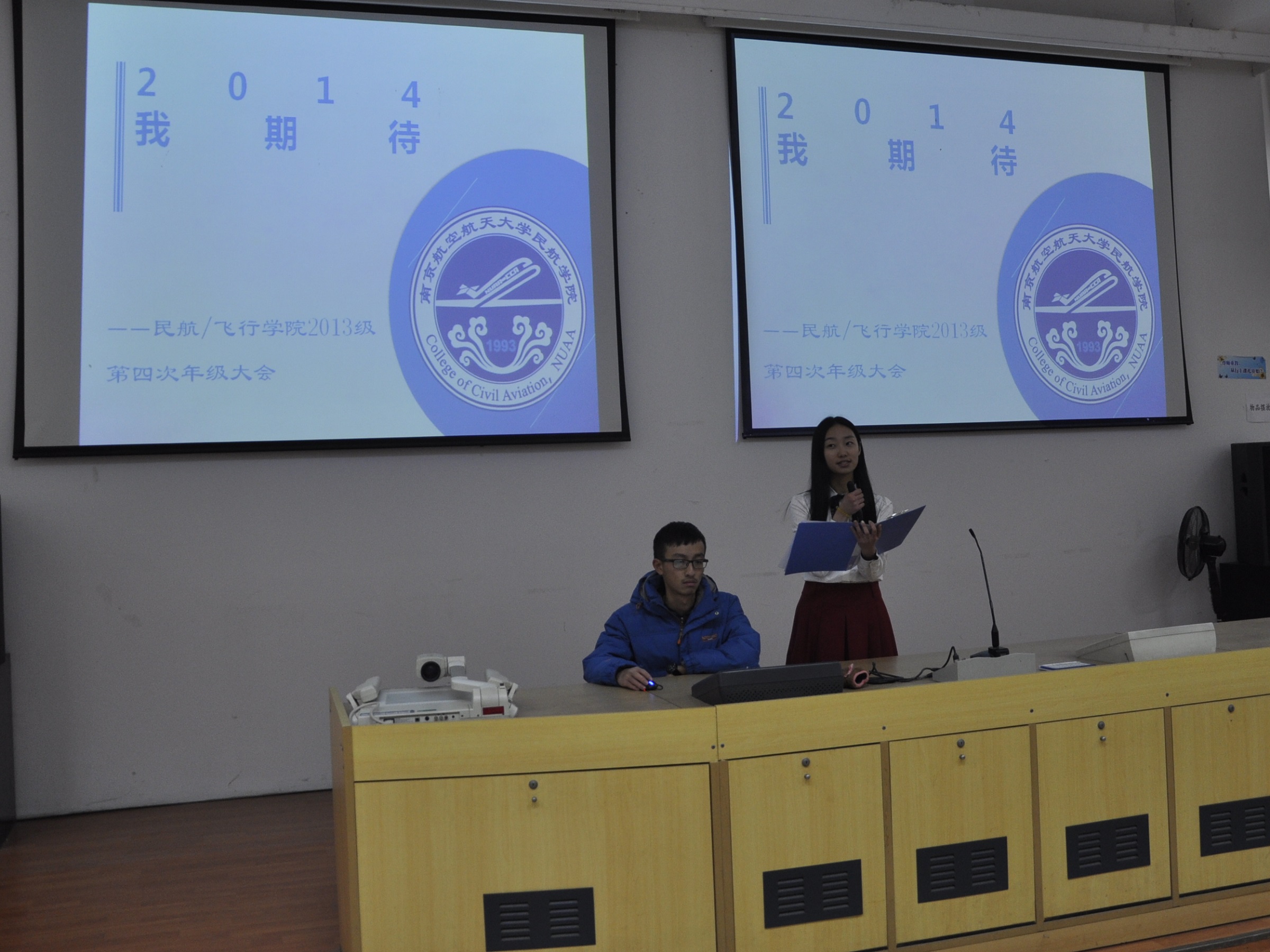 2013年12月22日,民航/飞行学院大一全体同学于2110教室召开了主题为“2014,我期待”的年级大会。到场嘉宾有民航飞行学院团委书记傅成成老师,13级辅导员康冲和优秀实践团队的代表。
