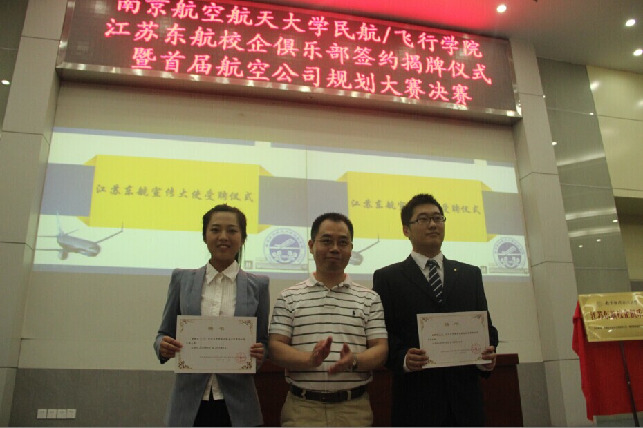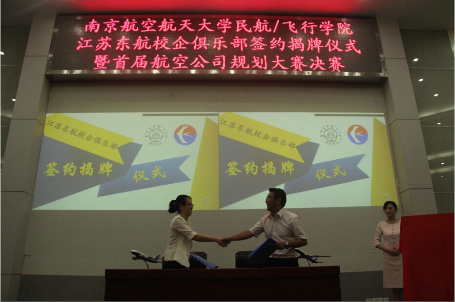 2014年6月13日晚上7点江苏东航校企俱乐部签约揭牌仪式在我校将军路校区一号楼四楼报告厅隆重举行。出席此次揭牌仪式的有江苏东航人力资源部规划配置部管理主管王心磊女士、飞机维修部副总经理兼总工程师肖志华、飞行签派分部高级经理杨加勇先生、飞机维修工程部工程师陈勇先生、人力资源部王树红女士,校学生处副处长许爱华老师、二次元 党委副书记宋凯老师、二次元 交通运输工程系主任曾小舟老师、二次元 交通运输工程系吴薇薇老师。参加此次揭牌仪式的还有校企俱乐部首批会员以及来自民航/飞行学院的老师与同学。