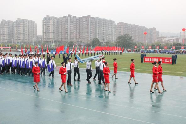 各学院方阵依次从主席台走过,精神抖擞地展示着各具特色的方阵变换。随即健美操、跆拳道、教职工广播体操及《小苹果》舞蹈的表演相继进行。我院提早筹备、精心策划,入场方阵极具民航特色,整齐划一的脚步凝结着队员们数月来辛勤排练的汗水;大团体健美操再展英姿,轻盈的跳跃彰显着青年人的活力朝气;可爱可敬的老师们的广播操表演也成为了开幕式中一道亮丽的风景线。最吸引眼球的莫过于由我院飞行员表演的《小苹果》,他们从青奥志愿"砳砳"成功转型为运动健儿"砳砳",续写着关于最美名片的精彩故事。