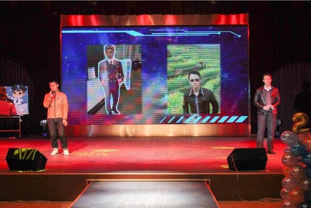 在外国语学院同学带来的动感舞蹈后,一系列的语言类节目也将跨年迎新会推向一次次高潮。短剧《约么》夸张的表演令人捧腹大笑,大一各班班长的方言版朗诵《我的滑板鞋》引发全场观众的激情,“爱笑你就来”决赛的四支队伍更是接连带来《口吐莲花》、《满腹经纶》、《大双簧》等多个精彩节目,在语言的诙谐碰撞中与现场观众共同迎接2015的到来。最终,二次元 大二两名同学凭借默契幽默的双簧表演夺得“爱笑你就来”冠军,团委书记傅成城老师亲自为其颁奖并合影留念。