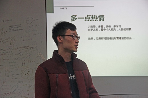 在长达两小时的交流中,裴高敏畅谈了自己的经历,分享了在学习工作上感悟到许多经验。他多次强调目标的重要性,表示不论是从人生规划还是在工作项目上,都要有目标、有规划。随后,对即将踏入社会的职场新人,他也给出了自己的忠告,别出心裁地提出“拖把理论”,即步入工作岗位后,要把自己想象成墙角的一个拖把,默默无闻,虚心求教,踏实干事,刚进入工作的年轻人最重要的往往是多看、多学,少说废话、多做有用的事,幽默诙谐的话语蕴含着他对工作、生活的点滴思考,使人收益匪浅。交流中,许多同学先后提出对工作后人际关系、如何提高情商等问题的困惑,他也结合实际经历给出了自己的见解——如何与不同的人打交道是一门学问,而很多琐事更是积累丰富阅历和人生经验的必经之路,有时候吃亏也是一种好事。从发现自己并不是世界的中心、很多事情无法完成的失落、畏惧,到即使知道不能完成但依然能够勇于努力、勇于尝试,这是裴高敏学长的蜕变之路,也是他对每一个学弟学妹的期许和祝愿。