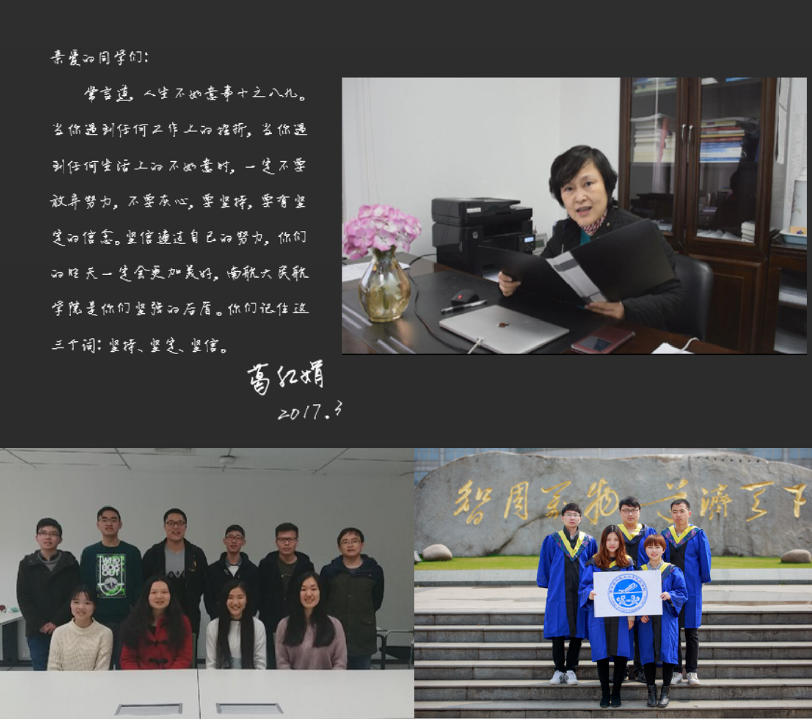 2017届研究生毕业季系列活动,以真挚的情感感染人,以丰富的活动教育人,以科学的规划塑造人,为即将毕业的学子们画上一个圆满的句号,同时引导研究生在毕业之际感恩师长、奉献母校,坚定理想、立志民航,增强毕业研究生爱校荣校情结。今日南航民航人,明日民航南航人!