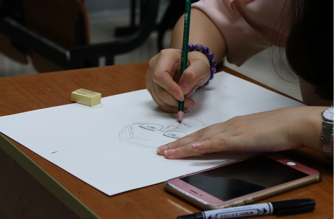 最有趣也是最具独特意义的第二部分开始了。首先,黄依宁同学担任起“绘画小教师”的职务,详细介绍了线描的基础知识和如何画好人物肖像画的技巧,并现场演示了对全身像和脸部肖像的绘画过程。