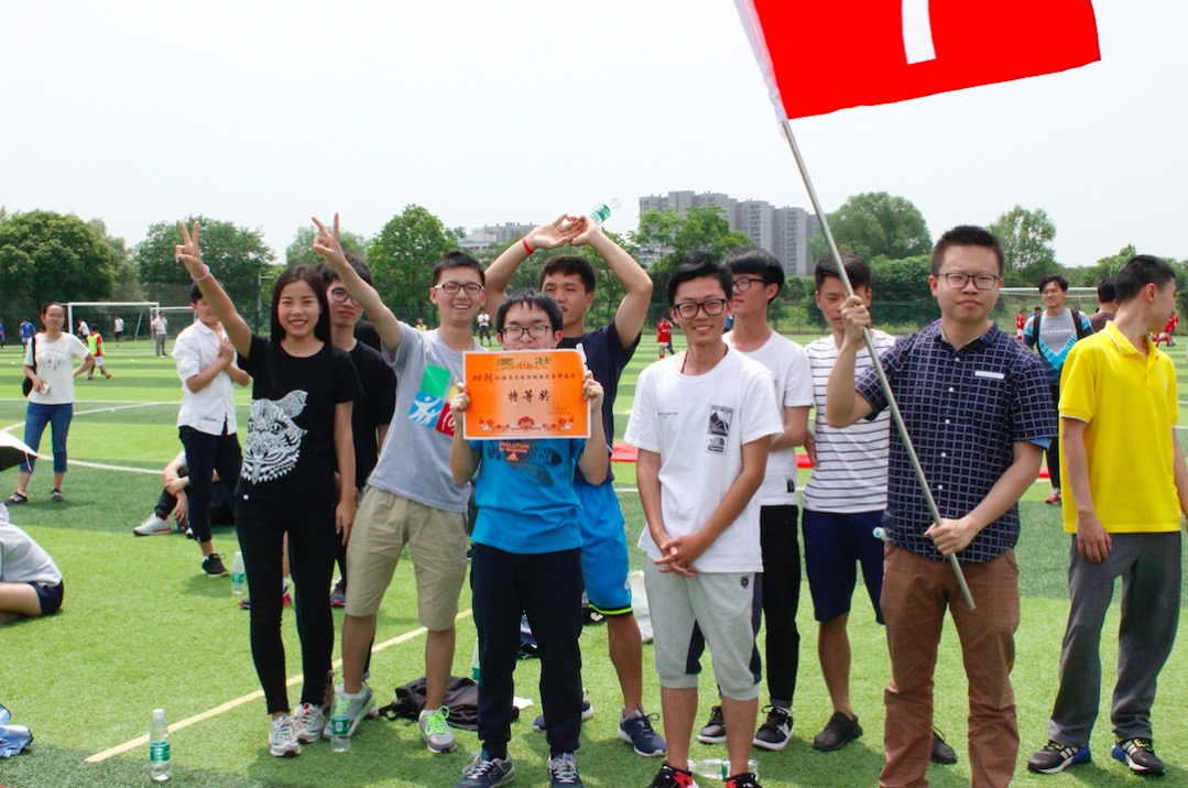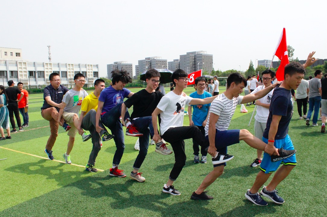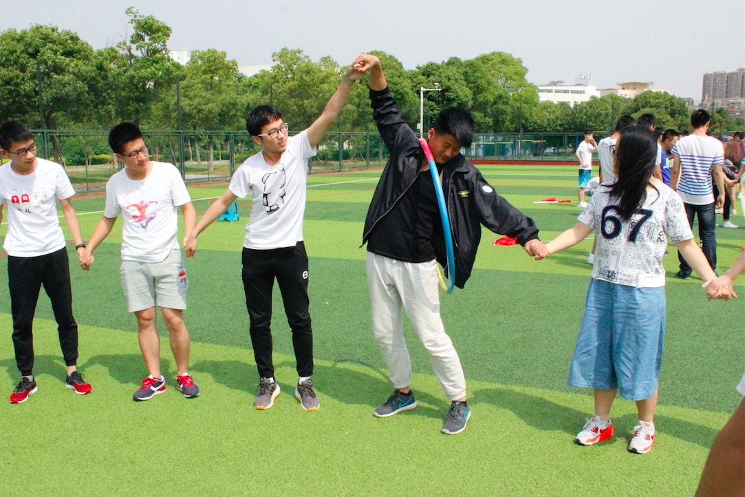 第二个项目“齐心协力”也同样极具看点。在这个项目中,参赛队员8人站成一纵队于起跑线上,每人用右手握住后一名队员的右脚腕,听到开始信号后,一齐用左腿向终点处蹦,赛道共长30米。在短暂的热身后,第一组四支队伍开始了比赛,每个队伍都喊着自己的号令,一齐奔向终点。令人印象深刻的第9队同学的排头队员为了与其它队员保持步调节奏一致,选择了横向跨走的方式,最终得到了第二名的好成绩。同时,祝贺第4队和第7队分别斩获第一名与第三名的头衔。
