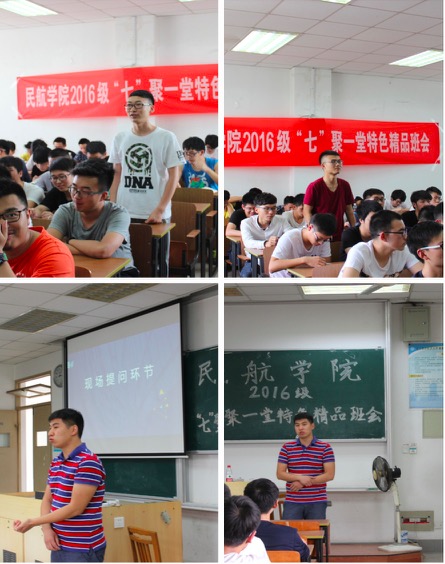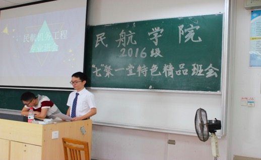 在班会的第一个环节中,曹宏庆学长从自身经历出发,为我们解答了机务专业今后的就业方向、成长路线、薪资待遇以及读研的意义等等同学们比较关心的实际问题。学长的发言中“干货”满满,加深了同学们对机务专业的认识,消除了同学们心中的困惑。此外,曹宏庆学长也一再强调,大学期间一定要抓好学习,尤其是加紧步伐提高英语能力,同时努力提升自身的专业技能。同学们对学习的重要性又有了新的了解和认知。