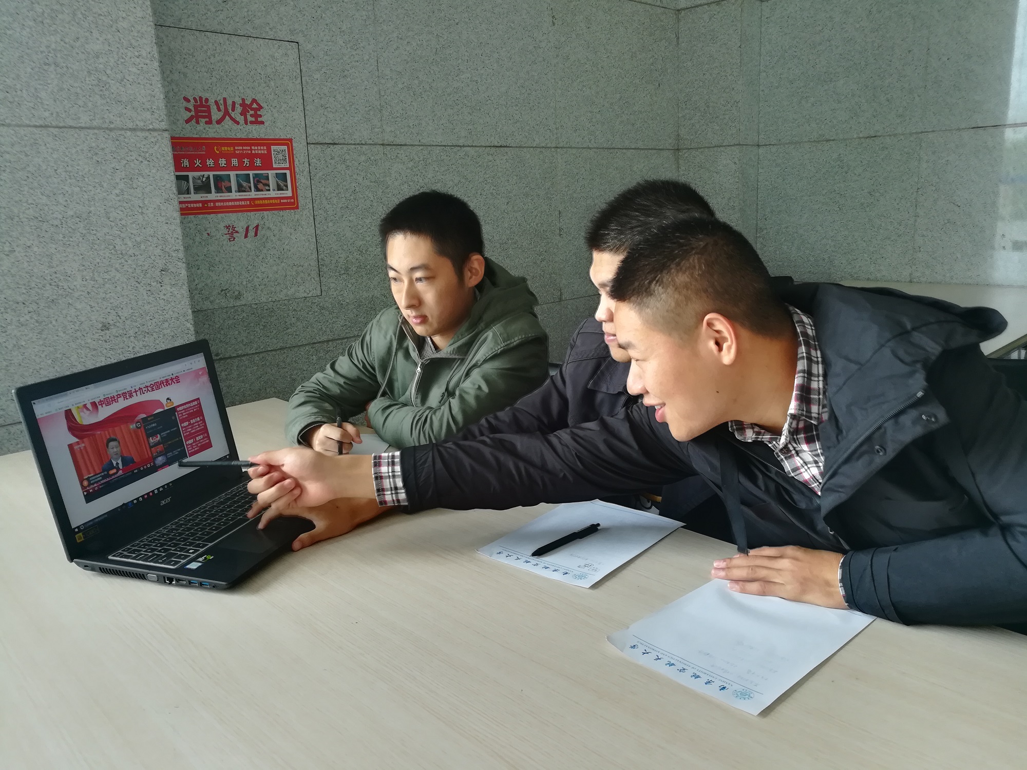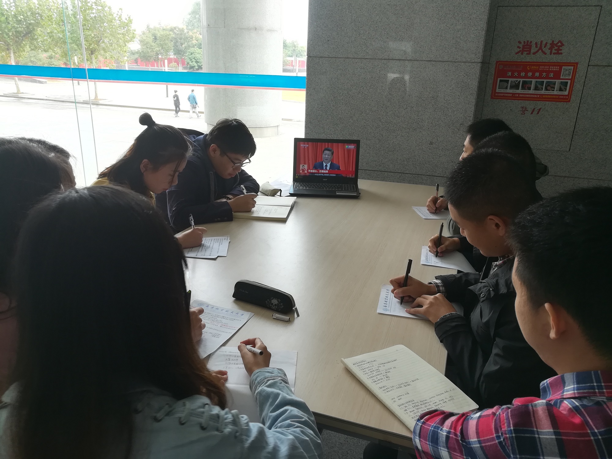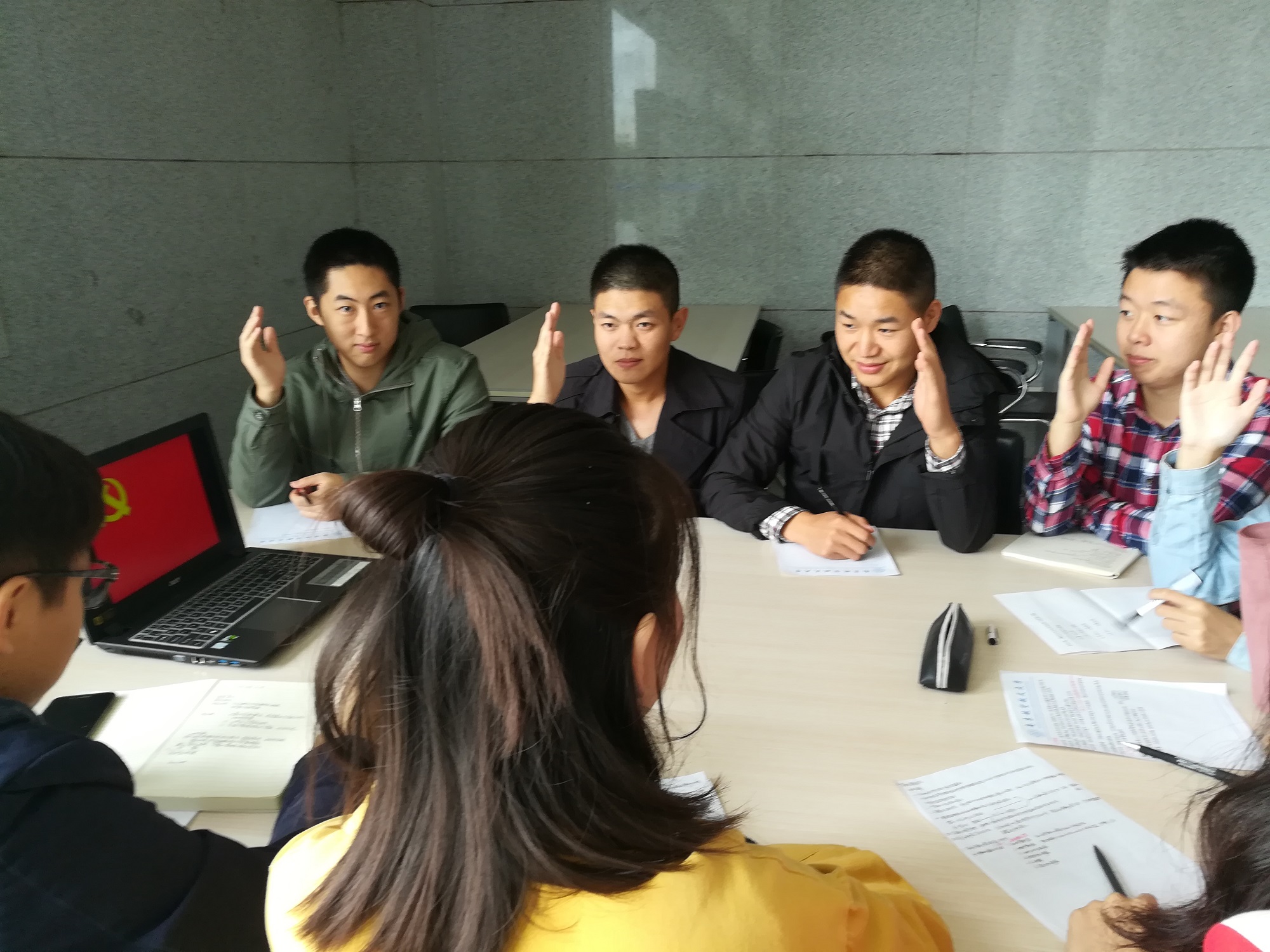 10月18日15点,在观看党的十九大开幕式直播之后,二次元 14级党支部组织全体党员模拟十九大的会议流程,于一号教学楼一楼大厅开展“迷你十九大•我们有话说”交流活动。大家围绕民航大发展的话题,结合专业知识及行业现状,各抒己见,为我国民航发展献计献策,以实际行动迎接党的十九大。会议由党支部小组组长于金锦主持。