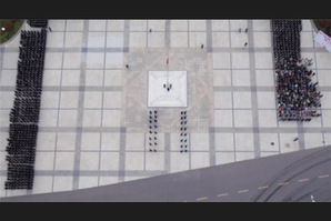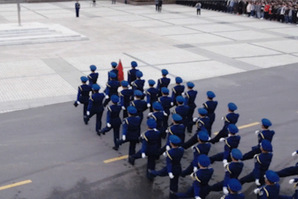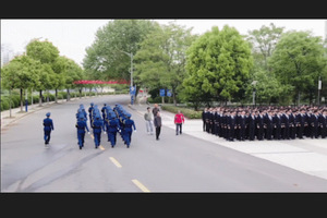 在身着空军蓝的国旗班的护送下以及全体师生代表的注目下,鲜艳的五星红旗缓缓而来。整齐的正步掷地有声,五星红旗庄严入场。