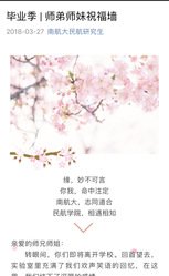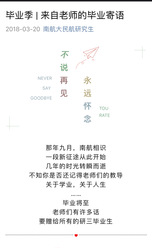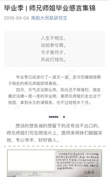 研究生三年的学习生涯中,每一步前行都离不开老师的引领与指导,每一份师生情都是最值得珍藏的记忆。毕业季,学院以师生情为主题开展了“毕业联播”系列活动,活动涵盖“来自老师的毕业寄语”、“毕业感言集锦”、“毕业祝福墙”三个子活动,通过语言文字、视频,记录毕业生们在二次元 三年研途生活的点滴过往。“来自老师的毕业寄语”活动,邀请各专业老师对即将毕业的2018届研究生们书写毕业寄语,劝勉毕业生在未来的人生道路上不畏失败、敢于拼搏。“毕业感言集锦”活动,通过手写明信片的形式,记录每一位毕业生三年民航生活的研途感悟和对南航校园生活的不舍,表达毕业生们与民航师生三年朝夕相伴的师生情,民航情;“毕业祝福墙”活动,邀请研一、研二的同学们将心中想对毕业师兄师姐说的话录制成视频,分享与师兄师姐朝夕相处的感动,送上最暖的祝福,并将视频拼接成一面“毕业祝福墙”,为即将离别南航生活的毕业生们送上最真挚的祝福。