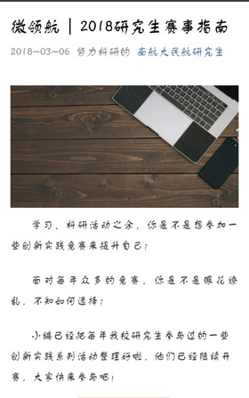 本次毕业季推出了“微领航”活动,包括大赛领航、期刊领航、就业领航三个模块。大赛领航为研究生们总结了以往的创新实践系列活动供大家选择,包括全国研究生数学大赛、全国研究生未来飞行器创新大赛等。期刊领航以数据说话,向研究生们展示2017年度我院论文发表情况。就业领航为大家送上一周的南京实习列表,让大家在科研之余,积极实践,为未来更好的融入社会打下基础。