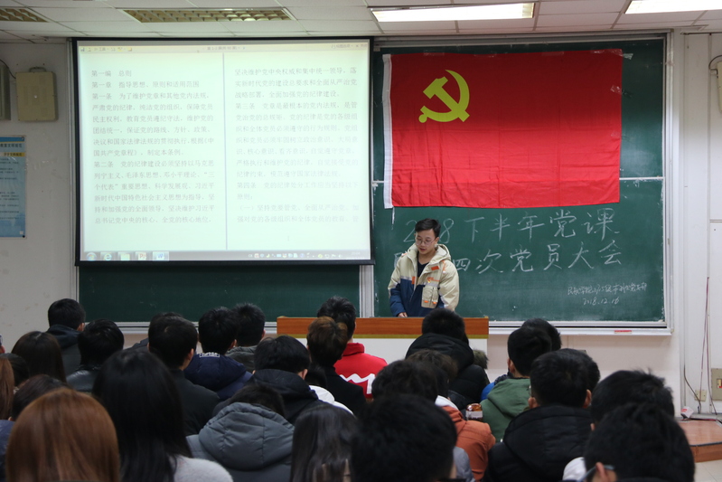 12月16日晚,二次元 15级党支部在将军路校区6101教室举办了关于《中国共产党纪律处分条例》的党课学习。本次党课学习包含了15级党支部正式党员及预备党员共七十余名学员,党支部书记杨靖宇同志作为主讲人,主持了这次学习活动。
