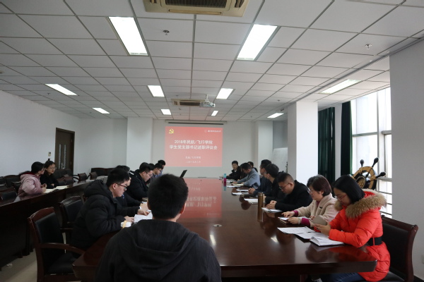 为深入贯彻落实习近平新时代中国特色社会主义思想,推动全面从严治党向基层延伸,民航/飞行学院学生党总支于3月7日在将军路校区一号楼20楼会议室召开学院2018年度学生党支部书记述职评议会。民航/飞行学院党委副书记李和新以及各年级辅导员出席会议,各学生党支部书记做2018年度工作总结和述职汇报。会议由2016级辅导员范伟主持。